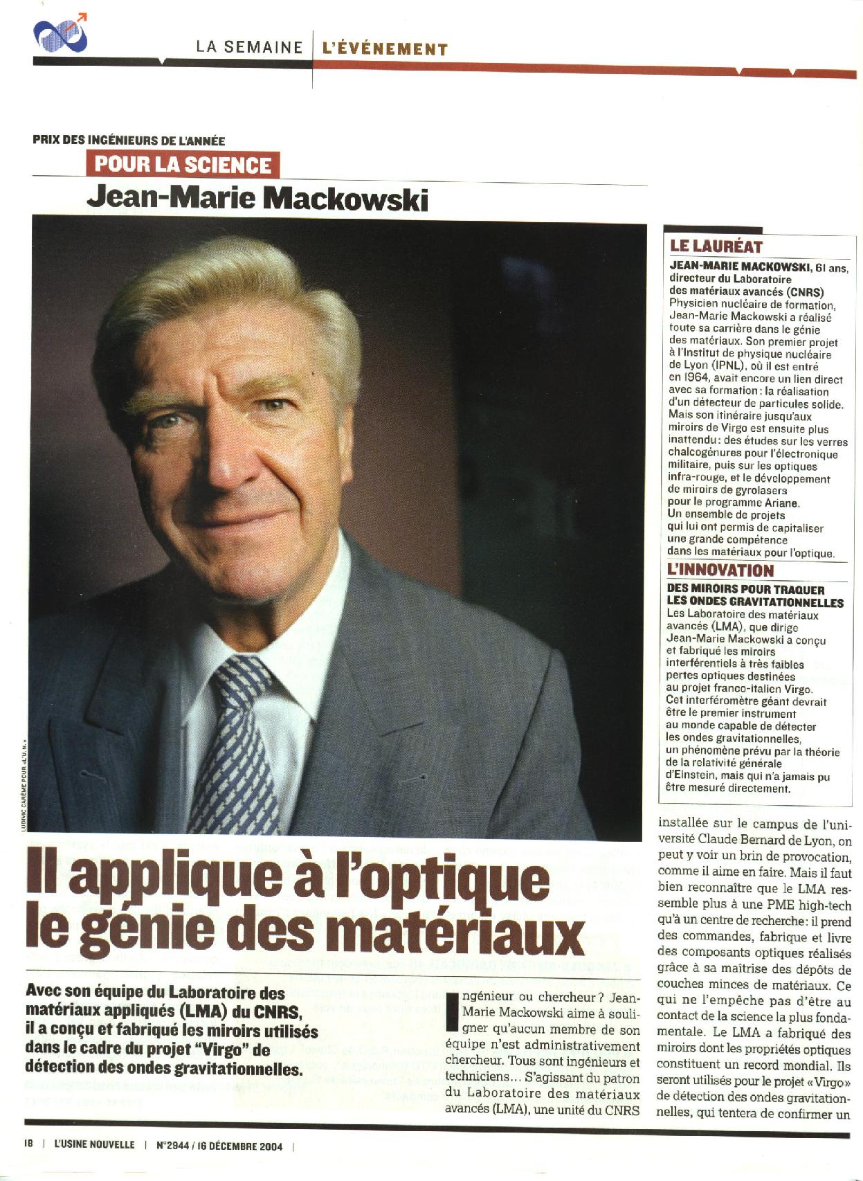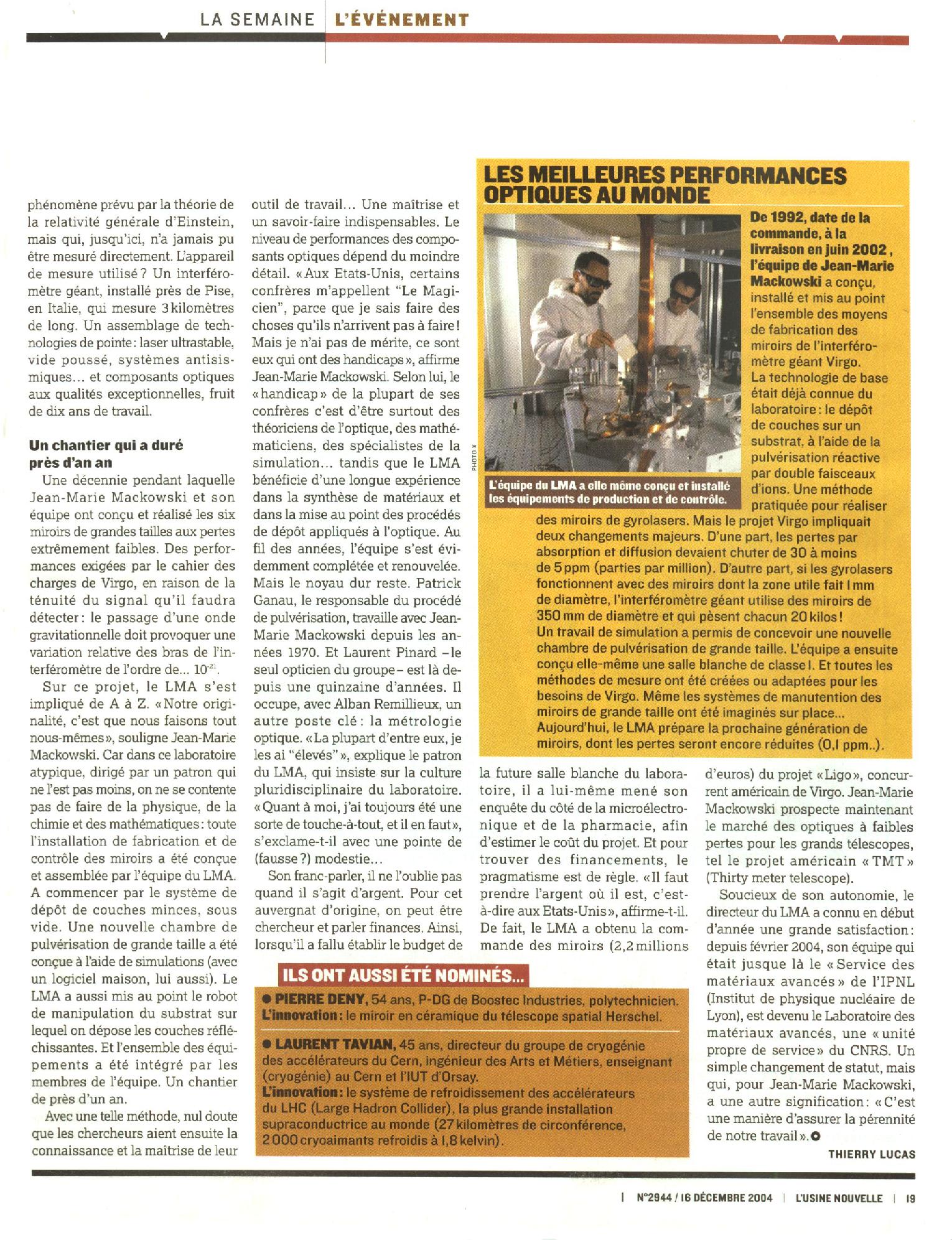 L'article paru (2 pages) dans l'Usine Nouvelle n°2944 du 16